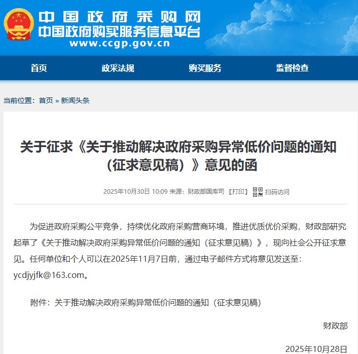 財政部就《關于推動解決政府采購異常低價問題的通知(征求意見稿)》向社會公開征求意見